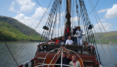 Beyond Bear Mountain Bridge, we enter the Hudson Highlands. With the sun beaming down on us, Mr. Linehan can also finally introduce the students to the quadrant and the concepts of celestial navigation.