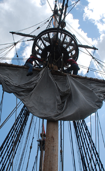 Now that we're done sailing for the day, we need to furl the sails. Mr. Moore eagerly hops up the fore mast and waits for his climbers to join him.