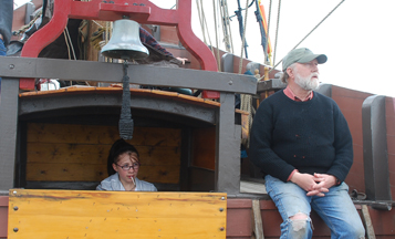 As a note, the large, black anchor pictured here closely resembles the historical anchors the original Half Moon would have carried, but it's actually just for show. The real anchor is the one dangling below Mr. Morel.