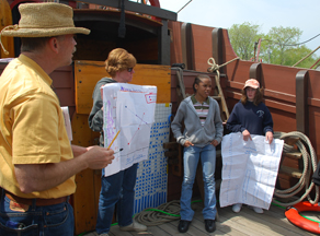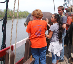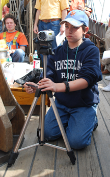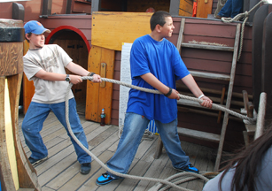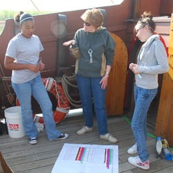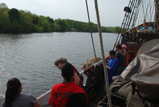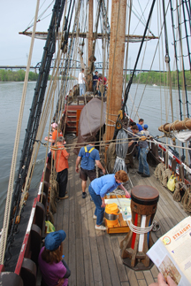 With all the voyage coming to a close, many students take the opportunity to tackle whatever challenges they've not yet overcome on board. Daniella decides to climb to the main top, is accompanied by Jasmine and Mr. Schuijer. With no furling or sail handling to be done, they can simply enjoy the view (including the sights of downtown Albany and Rensselaer, which can only be seen from this lofty position).