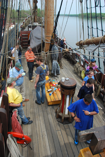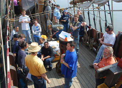 The students use up the last pictures in some of their cameras. Just after this snapshot is taken, Mark Morel leads the crew in lowering the main topmast, just as we lowered the fore topmast earlier. The process goes quickly and remarkably smoothly.