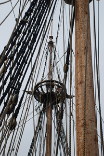First we'll tackle the fore mast. To lower the fore top mast, Mark Morel runs a special support line from the bottom of the top mast, up through the lower masthead, back down through the fore deck to the foc's'le, and from there to the capstan.