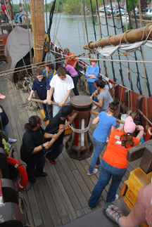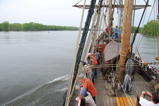 Mr. Morel calls all hands on deck to assist. As we pass New Baltimore, the capstan team slowly allows the fore top mast to slide down the lower mast and out of harm's way.