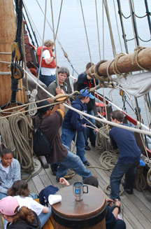 Here you can see Muhammad and Beniah sweating while Jacob and Jesse tail. Sweaters heave on the lines, using their full body weight, while tailers keep a tight grip on the line after it passes around a belaying pin and immediately take up any slack.