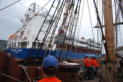 We cast off our lines and leave the Port of Albany. As we go, we pass this massive freighter being loaded with wind turbine blades. Ships like these are the modern equivalent of the great sailing ships working the East India Company's spice trade in the era of the original Half Moon.