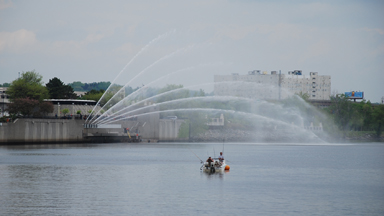The Riverfront Pumping Station at the southern end of the Corning Preserve is the Half Moon's home in Albany. As we draw near, they fire their water cannons to celebrate our arrival.