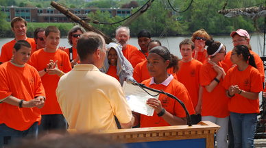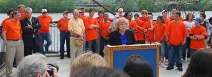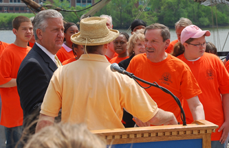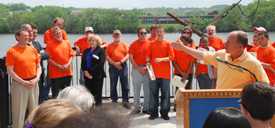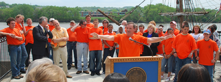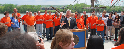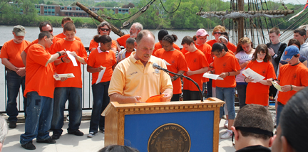 At the arrival ceremony, Albany Mayor Jerry Jennings weclomes the Half Moon and acts as master of ceremonies, introducing each of the other speakers, including New York Commissioner of Transportation Astrid Glynn and Times Union columnist Fred LeBrun (who earned his crew shirt sailing with us in 1999).