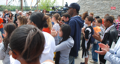 Several students climb up to stand on the yards and help greet the crowds as we arrive.