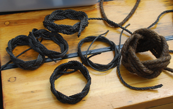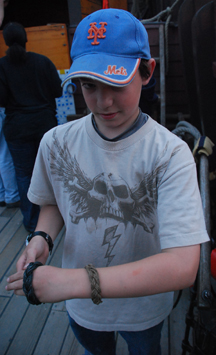 Students on this voyage also enjoyed learning how to make bracelets, which they can wear home as souveniers. These bracelets are made using an advanced knot called a Turk's head. Jacob shows that this will actually be his second marlinspike bracelet; he already made one for himself some time ago. Several students have also made spare Turk's heads, either for themselves or to give to friends back home.