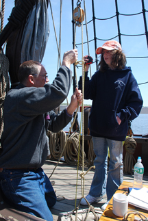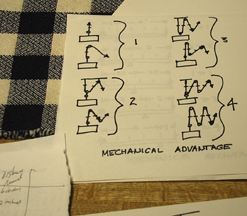 For our experiments in mechanical advantage, we rigged a block-and-tackle system designed to lift a lead ballast ingot (safely wrapped in canvas) a few inches off the deck, using from one to four pulleys to distribute the load. As students haul on the line, a spring scale measures how many pounds of force must be exerted to lift the weight. As an interesting side wrinkle, our spring scale can only measure up to 50 pounds, and the ingot weighs considerably more. Thus, students must extrapolate the ingot's true weight from their findings.