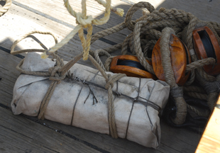 Above the ship, we use dozens of blocks (pulleys, such as those pictured) in the rigging to handle the sails. The lateen sail alone, our simplest sail, uses more than twenty!