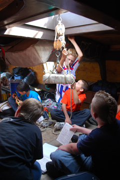For the students' group presentation on mechanical advantage, we rigged a block-and-tackle system designed to lift a lead ballast ingot (safely wrapped in canvas) a few feet off the orlop deck, using from one to four pulleys to distribute the load. As students haul on the line, a spring scale measures how many pounds of force must be exerted to lift the weight. As an interesting side wrinkle, our spring scale can only measure up to 50 pounds, and the ingot weighs considerably more. Thus, students must extrapolate the ingot's true weight from their findings.