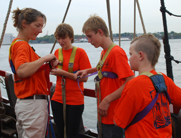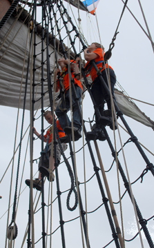 Under close adult supervision, our new crew members climb a few feet above the deck and perform a "hang test," hanging just by their hands for a few seconds. This lets us know that the climbers can support their own weight, and lets them know how tightly they need to grip the shrouds (the thick, black, upright lines in the standing rigging) to maintain their hold just in case they ever slip.