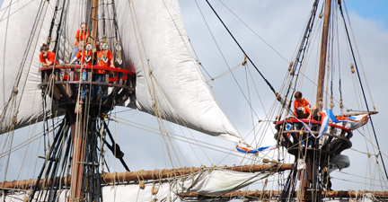 Crew members must thoroughly understand the techniques of climbing the rig in order to advance in the Crew Rating Log, but actually climbing aloft is not necessary. In fact, no one is ever required to climb the rig, and over the years we've had many valuble crew members on board whose feet always stay on deck. However, most new crew members consider climbing the rig to be a major accomplishment and source of pride.
