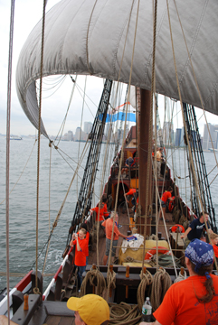 These sails both propel and help steer the ship. In fact, the fore sails have more effect on determining the Half Moon's direction than its rudder!