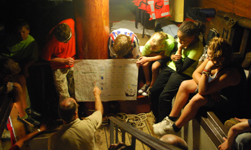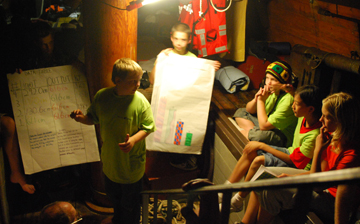 In the evening, after the ship's arrival at Verplanck, the entire crew came together on the orlop deck to receive the students' reports. Although both teams had collected the same data, each used different methods to arrive at their results.