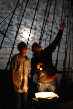 The Anchor Light: When the ship is at anchor, we raise a marker from the fore mast. Its light shines at night (seen above), and during the day the marker is visible as a black ball. This anchor light is standard maritime practice. At night, it alerts passing vessels to our location, and regardless of the time of day it informs other vessels that we are at anchor and are thus stationary. During the night, the Anchor Watch teams must keep an eye on the anchor light to ensure it does not go out.