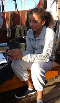 Since learning to use our scientific gear is a central part of the orientation phase, the photos below illustrate our student crew members taking readings for the Deck Log rather than focusing on the topics of their own projects.