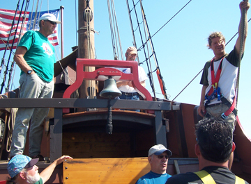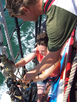 Once the fore deck team has hauled the anchor up from the waterline, Ms. Laufer secures it to the fore channel.