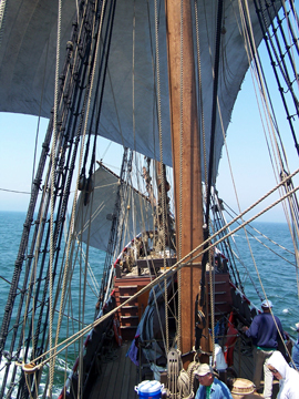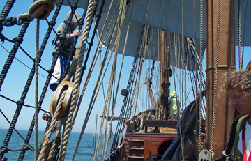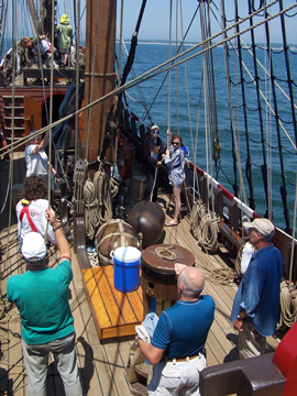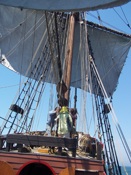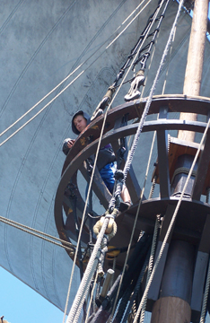 With topman Reynolds helping to feed the sail out of the basket, the topsail is soon raised and drawing.