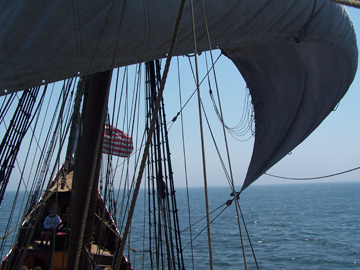 With five of the ship's six sails now drawing the wind, the Half Moon is cleaving along on a generally easterly course.