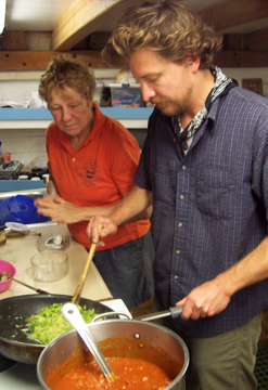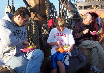 Dinner's served! The crew enjoys their lasagna in the light of the setting sun.