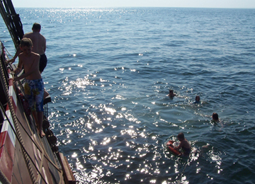 The sequel to yesterday's swim call seems to have drawn a larger audience. About half the crew elects to cool off in the waves.