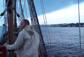 Captain Reynolds keeps a close eye on the potential squall as we enter the long channel leading to the New London harbor.