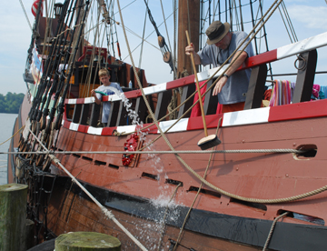 We make sure to clean the outer wales and channels as well. We can feel the humidity building throughout the day, so the deck wash will not only clean the ship but also help cool it down.