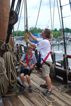 We're also still hard at work on our project of applying a fresh coat of wood preservative to the masts. The mizzen mast is now finished, so Ewout straps Nick into a bosun's chair and hoists him up to start work on the main mast.