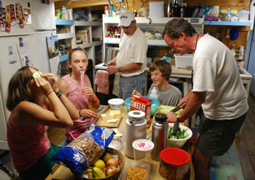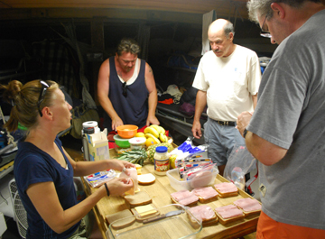 When the weather is fierce -- be it hot and sticky or cold and damp -- the galley is never at a loss for helpers. While chopping vegetables for tonight's salad, Evi pauses for a spa treatment.
