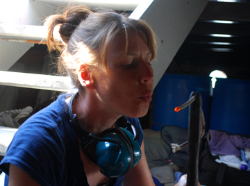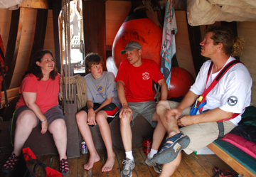 Meanwhile, some of the off-duty crew escapes the heat and sun by relaxing in the foc's'le, which seems positively spacious now that we've removed the science gear.