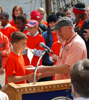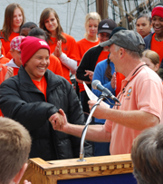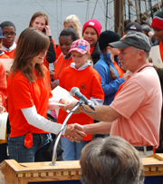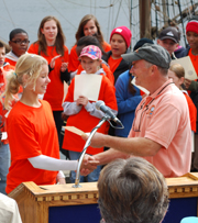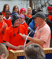 After a few words, he awards certificates of accomplishment to each student crew member, commemorating the successful completion of their Voyage of Discovery. |