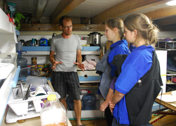 ...while Mr. Hensel shows the new crew around the galley, including how to refill their water bottles and how to wash up for galley duty.