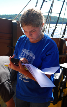 Each half hour during our operating day, the student crew members work in tandem to collect and record the current date and time, the ship's position (using latitude & longitude), the air temperature, salinity levels, wind speed and direction, relative humidity levels, and cloud cover. The students also continue to monitor atmospheric phenomena during Anchor Watch.