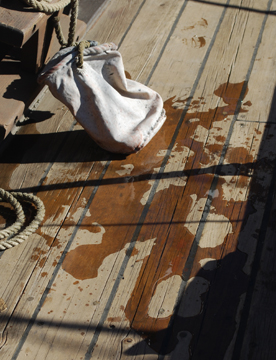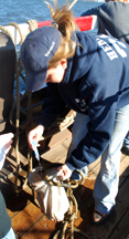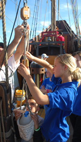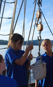 Procedure: While the ship remained at anchor off Piermont Marsh, the mechanical advantage team of Dakota, Gabrielle, Marije, and Rianne constructed a block-and-tackle simple machine in several configurations, using from one to five pulleys. They filled a bottle with water and placed it in a canvas bucket to fasten it to their rig, then marked the bottle so they could note when it had risen off the deck exactly two feet. The fixed weight and distance formed the constants in the experiment. With each pulley configuration, the students then lifted the weight and marked the line, measuring how much line had been pulled through the simple machine under each configuration in order to produce the constant.