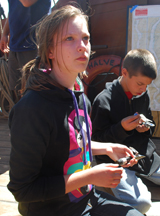 Procedure: Starting early in the morning while the ship remained stationary off Piermont Marsh, the celestial team used their instruments to track the course of the sun as it reached its zenith (highest point). At each reading, Kortnee aimed the quadrant at the sun (using its shadow to align her instrument rather than staring down its length directly at the sun). This determined the sun's elevation in degrees. At the same moment, Hansen used the directional compass to determine the sun's bearing, or azimuth. Alyssa and Lauren alternated between taking the quadrant reading or acting as official timekeeper.