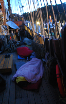 As dawn creeps over the horizon, we find that several hardy crew members have braved the chilly night to sleep under the stars. Within a few minutes, the ship is buzzing with activity.