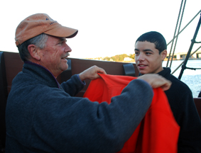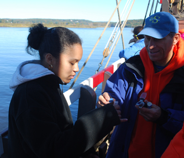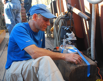 Mr. Garfinkel is also back on board and engaged in research. He's looking under the microscope at soil and water samples the students collected in the salt marsh this morning.