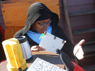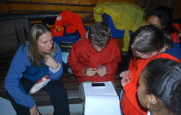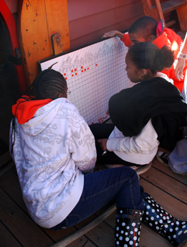 After their latest round of data collection, the Statistics team meets with Mr. Hensel up on the fore deck to discuss how their results are shaping up so far.