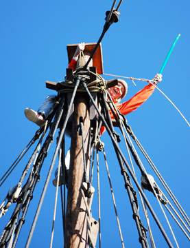We haven't forgotten about the low headroom of the I-95 Bridge. No fools we, we've sent Bosun Waiboer to the very top of the main mast with a broom handle. If the bridge dares to come too close, she will fend it off with her stick.