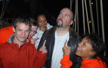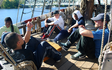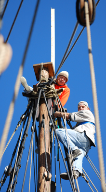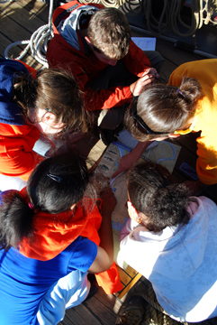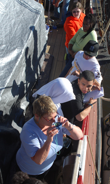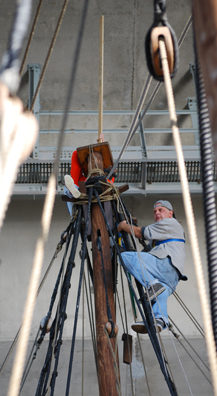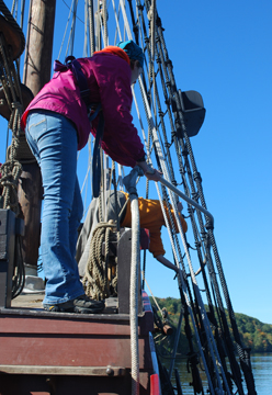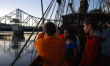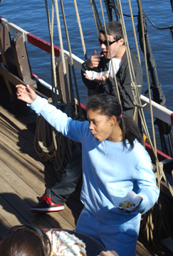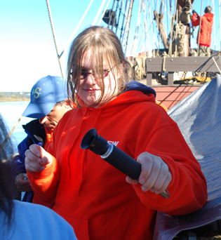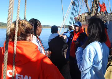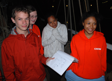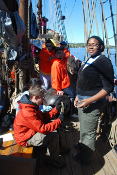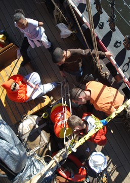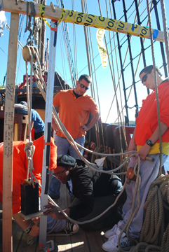 Yet another research team is deep into their work on the weather deck. With the help of their senior crew advisors Mr. Roy and Mr. Woodworth, and assists from others, the Mechanical Advantage team of Erica, Kelsey, Roberto, and Solange has erected a block-and-tackle rig by the main mast.