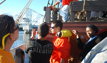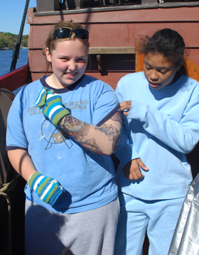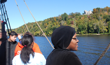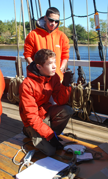 With the Half Moon securely docked, the students devote the rest of the afternoon entirely to collecting data for their projects. The Mechanical Advantage team spends the day reconfiguring their rig to test the effects of various leads on force and distance in their simple machine.