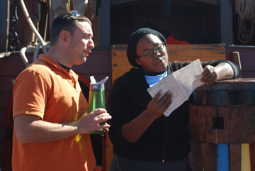 Meanwhile, in the shade of the orlop deck, Wilberto and Teara are quizzing each other on the Crew Rating Log.