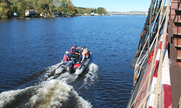 Our destination is just shy of the East Haddam Bridge ahead. Mr. Hansen zips Claudio and Mr. Hensel in to shore to handle our dock lines.