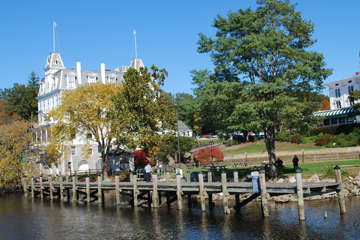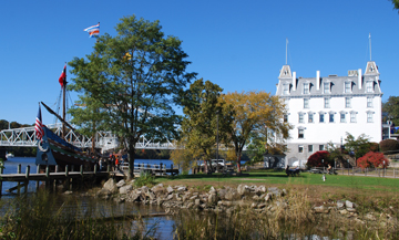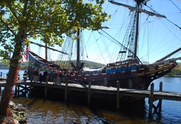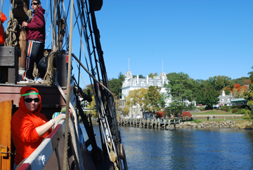 On our previous voyages up the Connecticut River, including the two previous Fresh River voyages and the Three Rivers Voyage of Discovery in 2006, the Half Moon has docked at the grassy landing in Haddam, but this time we're trying somewhere new: the dock at the Goodspeed Opera House (external link), directly across the river!