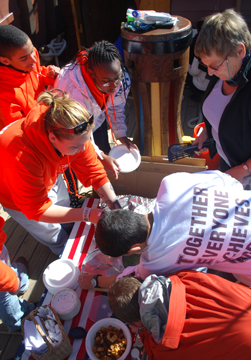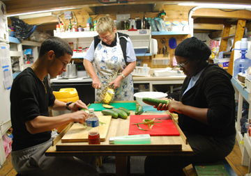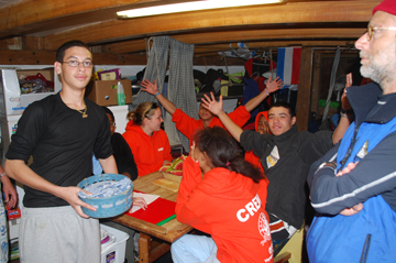 By sundown, the students are back on board and, in some cases, back on duty. Roberto and Erica help Ms. Bruijn chop vegetables for dinner.