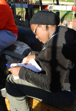 Yesterday was devoted to collecting water samples; now it's time to analyze them. Bibi is one of the first students to learn how to use a refractometer to measure salinity.