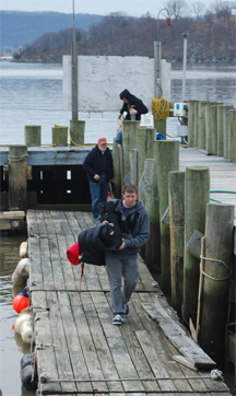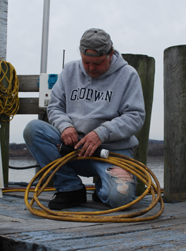 With the Half Moon idling in place for now, the crew turns to other matters, such as gathering up our shore power lines and other gear kept on the dock.