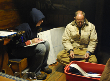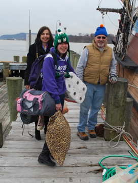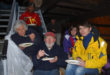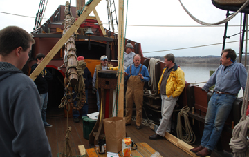 ...and she's pretty close! By now, the sun has set and temperatures have dropped sharply, so the crew has retreated to the comparatively warm confines of the orlop deck. We've also received a visit from local longtime supporter Corey Cummings, here to wish us well.